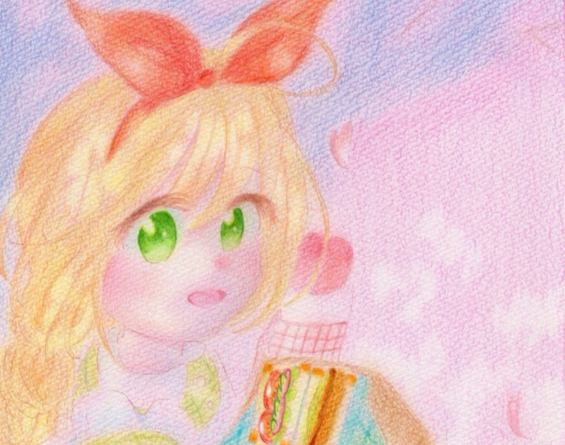 普通に描くだけではなにか寂しいというか、変えてみたくて桜の中にテコちゃんが居て見上げているような、光が落ちている感じが良いなあと想像を膨らませていきました*