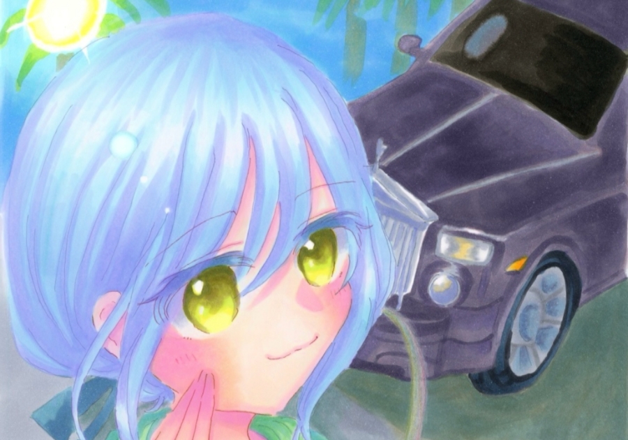 前にビーチでの姿を描いたこともあり夏の絵で夕影も描きたいなーとらくがきしていた絵を下描きとしてロールスロイスを資料を見つつ細かく描き込んでみました。