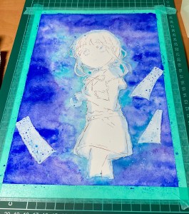 まずは命と服と傘の柄と短冊をマスキングして、それからマスキングインクを筆につけて人物を紙でカバーしてからスパッタリングでインクを飛ばし星のマスキングもしました。