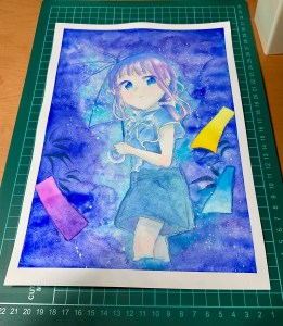 全体的にあまり影は濃くせず、髪はライラックにフレッシュピンクを混ぜたものを塗り、夜空にも使ったパーマネントバイオレットブルーを重ねてその上からお気に入りの青色のバヂターブルーも入れていきました。
