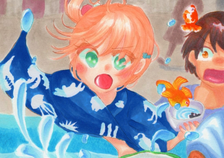 夏祭りで豪快に金魚をすくうめくりを描きました〜!