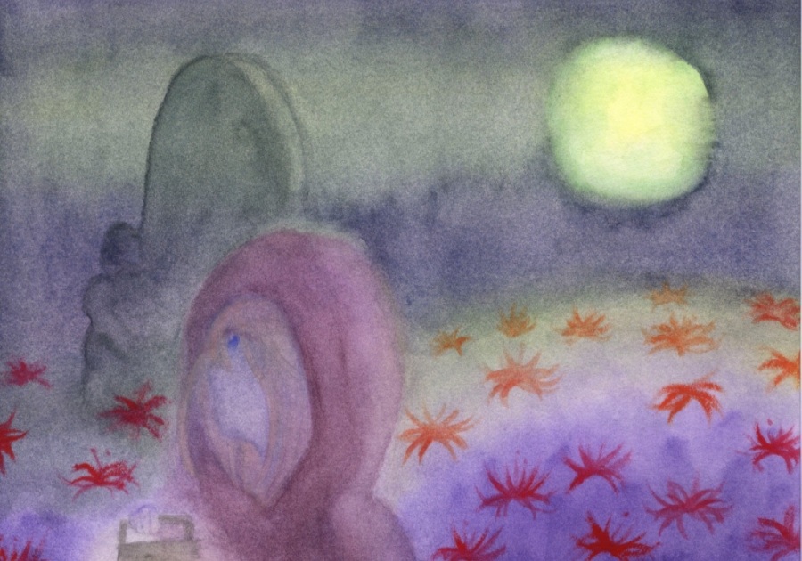 空がいい色になってくれてとくに月と溶け合うような滲みができたところと墓もいい味を出してくれた気がしてなんだかハロウィンっぽさもあるなあと不思議でした。彼岸花は和のイメージなので…!